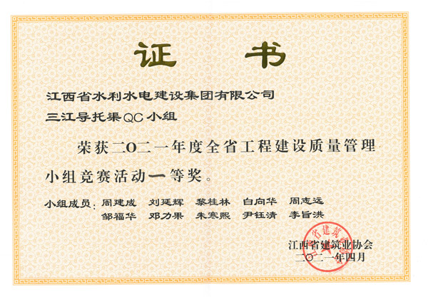 近日,2021年度江西省工程建設(shè)質(zhì)量管理小組競賽活動公布名次,由公司三江導托渠QC小組開展的QC活動榮獲小組競賽活動一等獎。該獎項的獲得,為公司工程創(chuàng)優(yōu)奠定了堅實的基礎(chǔ),為公司爭得了榮譽,今后,江水建設(shè)將繼續(xù)深入開展QC活動,秉承工匠精神推動質(zhì)量提升,打造更多精品工程,為樹立集團公司品牌形象繼續(xù)努力。