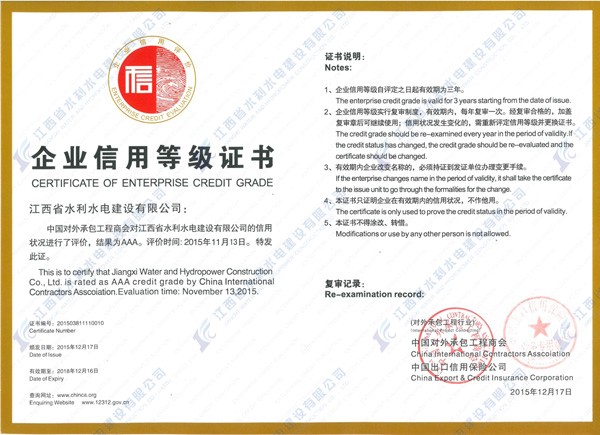 根據商務部、國資委聯合發(fā)布的《商會協會行業(yè)信用建設工作指導意見》和《關于進一步做好行業(yè)信用評價工作的意見》的要求,結合承包商會關于推進行業(yè)信用體系建設的工作部署,承包商會于2015年7月啟動2015年度對外承包工程企業(yè)與勞務合作企業(yè)信用等級評價工作,經對外承包工程企業(yè)與勞務合作企業(yè)信用等級評審委員會第十一次工作會議審議,江西省水利水電建設有限公司被評定為2015年度對外承包工程企業(yè)信用評價AAA級信用企業(yè)。