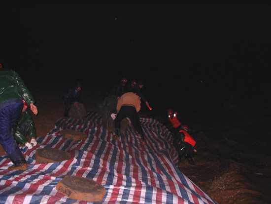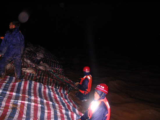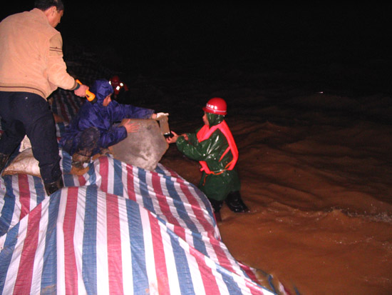 根據(jù)以往的施工經(jīng)驗(yàn),我們很快啟動(dòng)了搶險(xiǎn)應(yīng)急預(yù)案。但由于環(huán)境惡劣,考驗(yàn)我們的時(shí)候到了,要發(fā)揚(yáng)我們江西水建人“特別能吃苦、特別能戰(zhàn)斗、特別能忍耐、特別能協(xié)作精神”的時(shí)候到了,我們與洪水搶時(shí)間、爭(zhēng)進(jìn)度,全體干群在漆黑的大堤上是一片穿梭奔跑的身影,大家齊心協(xié)力,手提肩扛,把一百多斤一塊的混凝土預(yù)制塊,一塊塊運(yùn)到堤腳,此時(shí)項(xiàng)目部總工曾俊平不顧江水的寒冷,帶領(lǐng)其它幾名員工,奮身躍入水中,在水下鋪設(shè)彩條布,而此時(shí)水下溫度只有10℃左右,渾濁江水一浪高過(guò)一浪拍打在他們的身上。大家顧不上寒冷,顧不上疲勞,顧不上饑餓,衣服濕了又干,干了又濕,分不清是哪次被汗水還是雨水弄濕的,在微弱的手電光照亮下鋪設(shè)了一條又一條彩布條,碼起了一道又一道沙包小堤。經(jīng)過(guò)大家的緊張奮戰(zhàn),終于幾處險(xiǎn)情得到了控制,等到我們?cè)诿β抵谢剡^(guò)神來(lái)時(shí),已經(jīng)是次日的凌晨三點(diǎn)多鐘,盡管大家拖著一副疲憊不堪的泥身子,但大家臉上裝滿了滿意和勝利的微笑,王總此時(shí)飽含真情地對(duì)大家說(shuō)了一聲:“大家真的辛苦了,謝謝大家!”走在回家的路上,我正好與項(xiàng)目總工曾俊平走在一起,我看到他渾身濕漉漉的,我關(guān)心的問(wèn)他在水中冷嗎?他笑笑說(shuō)道:“這是關(guān)鍵時(shí)刻,再冷也要下”。他旁邊的同事告訴我,他是從下午三點(diǎn)鐘就一直在水里做事直到剛才,整整在水中浸泡了十二個(gè)小時(shí)。我們參加搶險(xiǎn)的同志被曾俊平這種不怕困難、不畏艱險(xiǎn)、不顧個(gè)人安危、敢于吃苦的精神深深感動(dòng)著,真是我們學(xué)習(xí)的好榜樣!