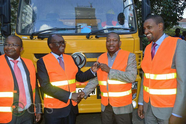 總督Mike Sonko及內(nèi)羅畢交通局部長James Wainaina Macharia在清污車前合影(左2為部長James,右2為總督Mike Sonka)