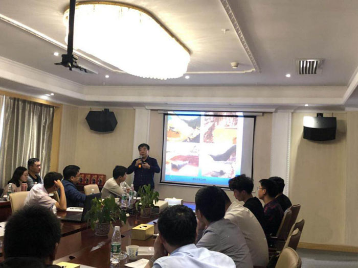現(xiàn)場參觀結(jié)束后,學習團參加了技術(shù)培訓和經(jīng)驗交流會??偨?jīng)理助理杜凌主持了開班儀式??偣こ處熀櫥汀㈨椖扛苯?jīng)理李成,對洋前壩水庫的大壩總布置、大壩施工導(dǎo)流、大壩及供水管道施工技術(shù)細節(jié)等,通過文字、圖片、視頻等組成的PPT課件為學員授課,并就學員提出的問題逐一進行了解答。
