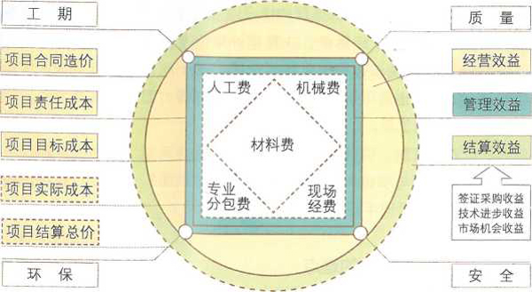 的關(guān)系。“接項(xiàng)目”確定了合同造價(jià),對(duì)應(yīng)方圓圖的實(shí)線圓;“做項(xiàng)目”的第一步是下達(dá)項(xiàng)目目標(biāo)責(zé)任書,確定項(xiàng)目責(zé)任成本,對(duì)應(yīng)方圓圖的責(zé)任成本方形,第二步分子公司在責(zé)任書的基礎(chǔ)上進(jìn)行項(xiàng)目實(shí)施策劃,產(chǎn)生項(xiàng)目的目標(biāo)成本,對(duì)應(yīng)方圓圖的目標(biāo)成本方形,第三步就是項(xiàng)目實(shí)施過程的管控,最終確定實(shí)際成本,對(duì)應(yīng)方圓圖的實(shí)際成本方形?!八阗~收錢”就是完成項(xiàng)目過程中的結(jié)算變更與最后的決算收款,從而確定結(jié)算造價(jià),對(duì)應(yīng)方圓圖的結(jié)夢(mèng)造價(jià)虛線圓。項(xiàng)目實(shí)施過程中進(jìn)度、質(zhì)量、安全、環(huán)保及周邊相關(guān) 方的管理對(duì)應(yīng)成本方形的四個(gè)支撐頂點(diǎn),構(gòu)成成本的五項(xiàng)費(fèi)用“材料、人工、機(jī)械、現(xiàn)場(chǎng)經(jīng)費(fèi)、專業(yè)分包”對(duì)應(yīng)成本方形的內(nèi)部區(qū)域。