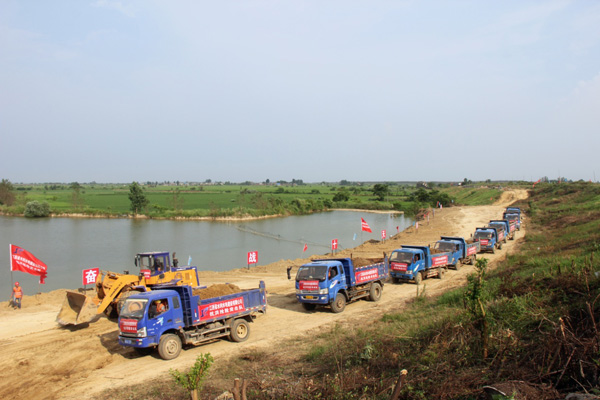 受前期連續(xù)強(qiáng)降雨及長江洪水倒灌、頂托影響,九江市河湖水位長時(shí)間處于超警戒水位狀態(tài),導(dǎo)致該地區(qū)防汛形勢十分嚴(yán)峻,圩堤險(xiǎn)情隨時(shí)可能發(fā)生,特別是堤腳處有池塘的圩堤更易出現(xiàn)險(xiǎn)情。為確保廬山市沙湖山圩堤長期穩(wěn)固,我司在接到該市防汛指揮部的除險(xiǎn)加固任務(wù)后,立即派遣抗洪搶險(xiǎn)突擊隊(duì)前往現(xiàn)場進(jìn)行搶險(xiǎn),以穩(wěn)固圩堤,確保圩堤內(nèi)村莊百姓及農(nóng)田安全。經(jīng)過現(xiàn)場勘查,突擊隊(duì)決定沿著圩堤腳有池塘的地段填出一條長約1公里、寬20米的壓浸平臺進(jìn)行加固處理。搶險(xiǎn)方案確定后,公司迅速組織了3臺挖掘機(jī)、2臺裝載機(jī)、36臺自卸汽車等機(jī)械設(shè)備及40多名作業(yè)人員頂著炎炎烈日進(jìn)行施工,力求在10天內(nèi)完成搶險(xiǎn)任務(wù),確保圩堤安全。